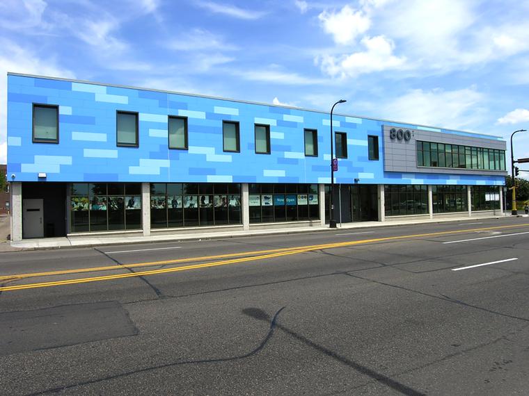 Blumentals/Architecture recently worked with Sherman Associates to convert an abandoned car dealership in North Minneapolis into an educational center. Existing building was a two story masonry shell with cast-in-place concrete and steel structure. Work scope included full building rehabilitation to accommodate new offices, businesses, and a school. Exterior block was repaired and new fiber cement & metal panels wrap the second floor. Interior tenants include Minneapolis Public Schools, Minnesota Department of Employment and Economic Development, and Northpoint Health and Wellness. Tenants share common building resources to encourage awareness of available services.